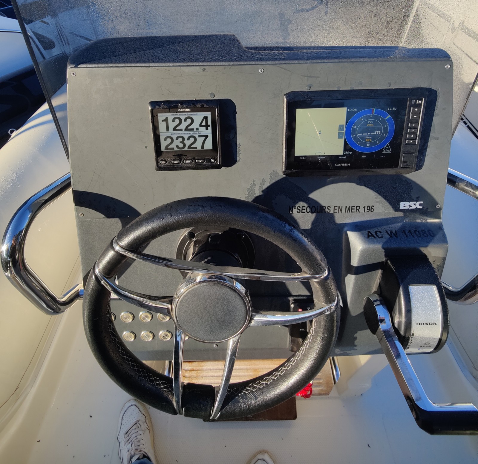 Le moteur Honda Marine est un BF 225 V-TEC DXDU Blanc avec commande pupitre electrique, afficheur 4 pouces garmin GMI20 et une hélice 3 pales inox.