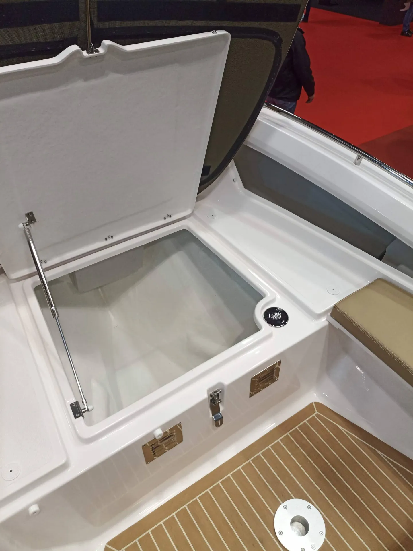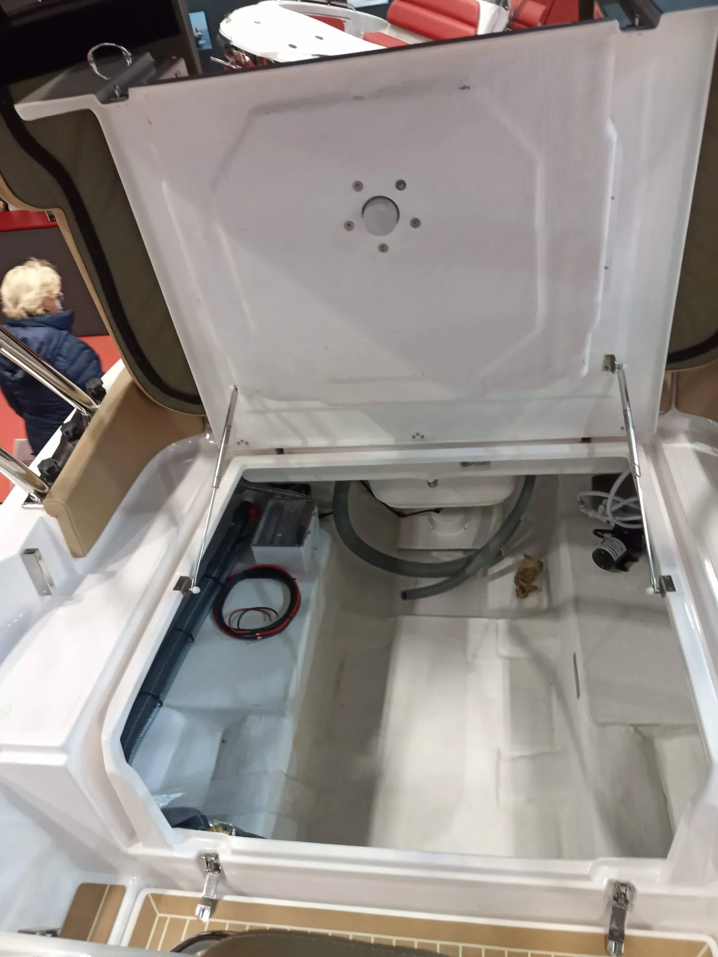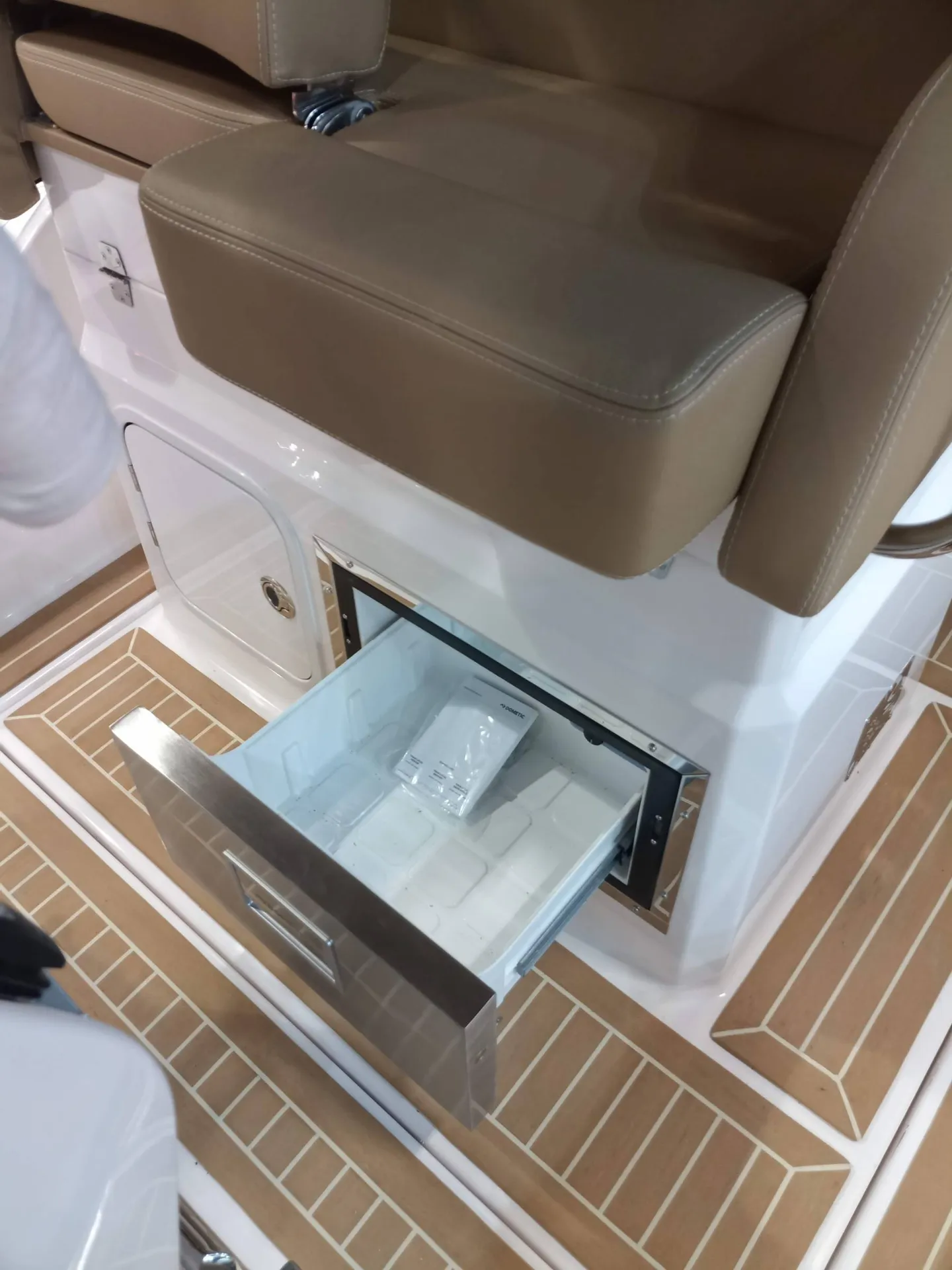 - La banquette du poste de pilotage se soulève pour révéler une cuisinette fort pratique, avec réchaud à gaz, évier et frigo-tiroir.